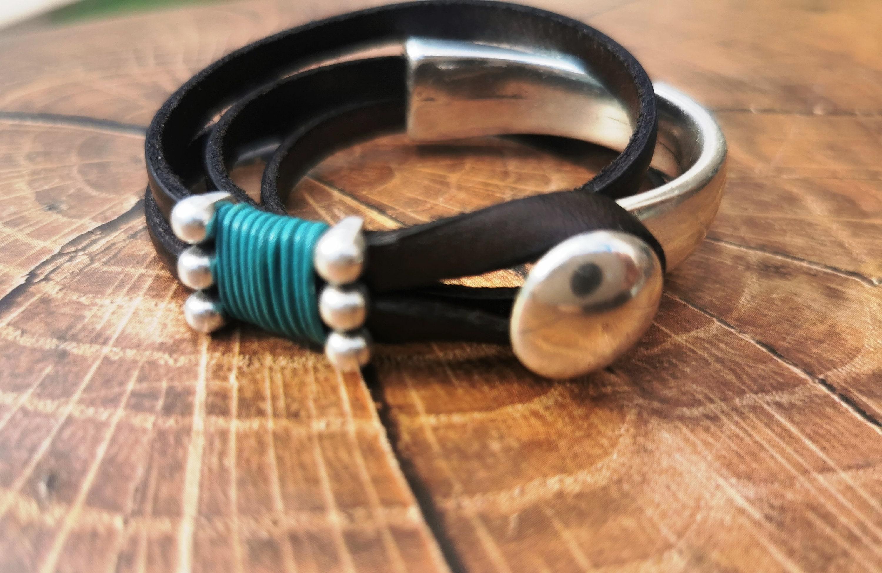 To preserve the look of your leather and silver jewelry, avoid water, cosmetics, and cleaning products. Always store your jewelryin a dry place and use a soft cloth to clean silver parts. Leather may naturally darken slightly over time, giving your jewelry a unique, lived-in feel.