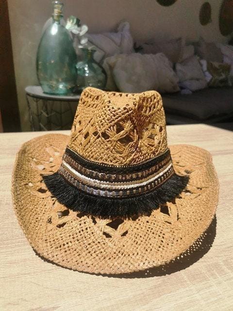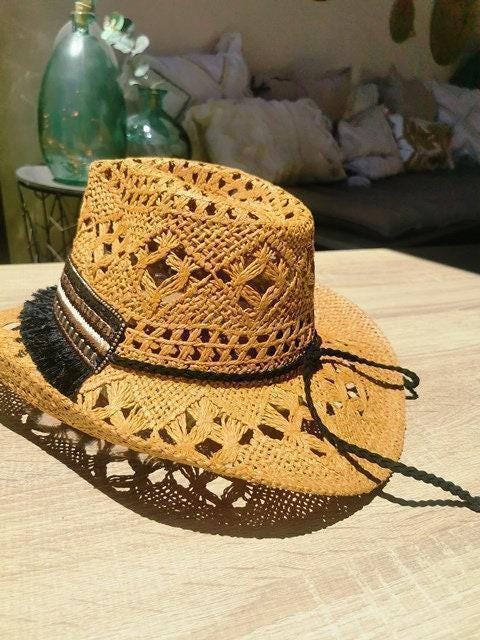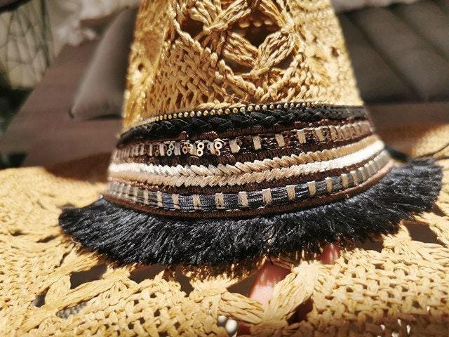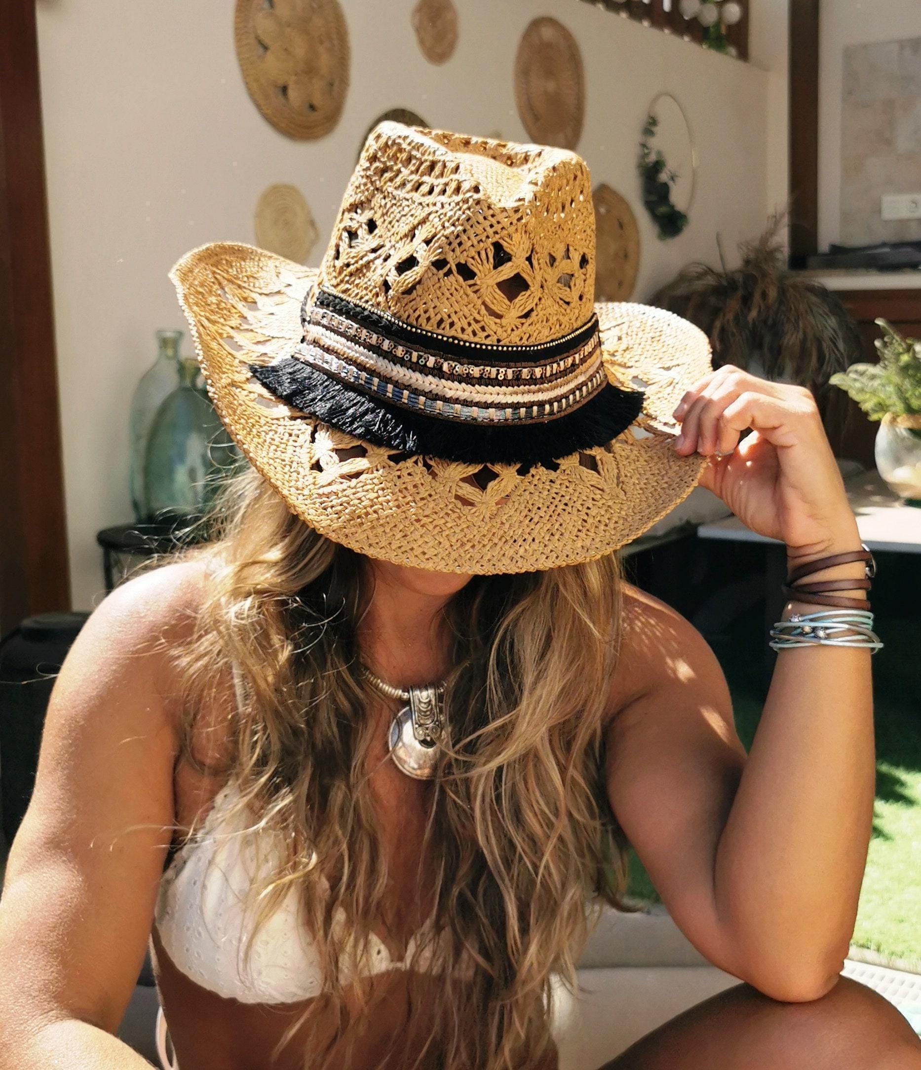 ♥ Handmade cowboy straw hat for summer outfits , vacation or holidays, elevate your style with this bohemian style hat custom made for Bride or Bachelorette party hat, or Music festivals. Unique custom hat perfect for birthday gifts, custom personalized gifts, and accessories gift. best selling items byKekugi bohemian Jewelry.