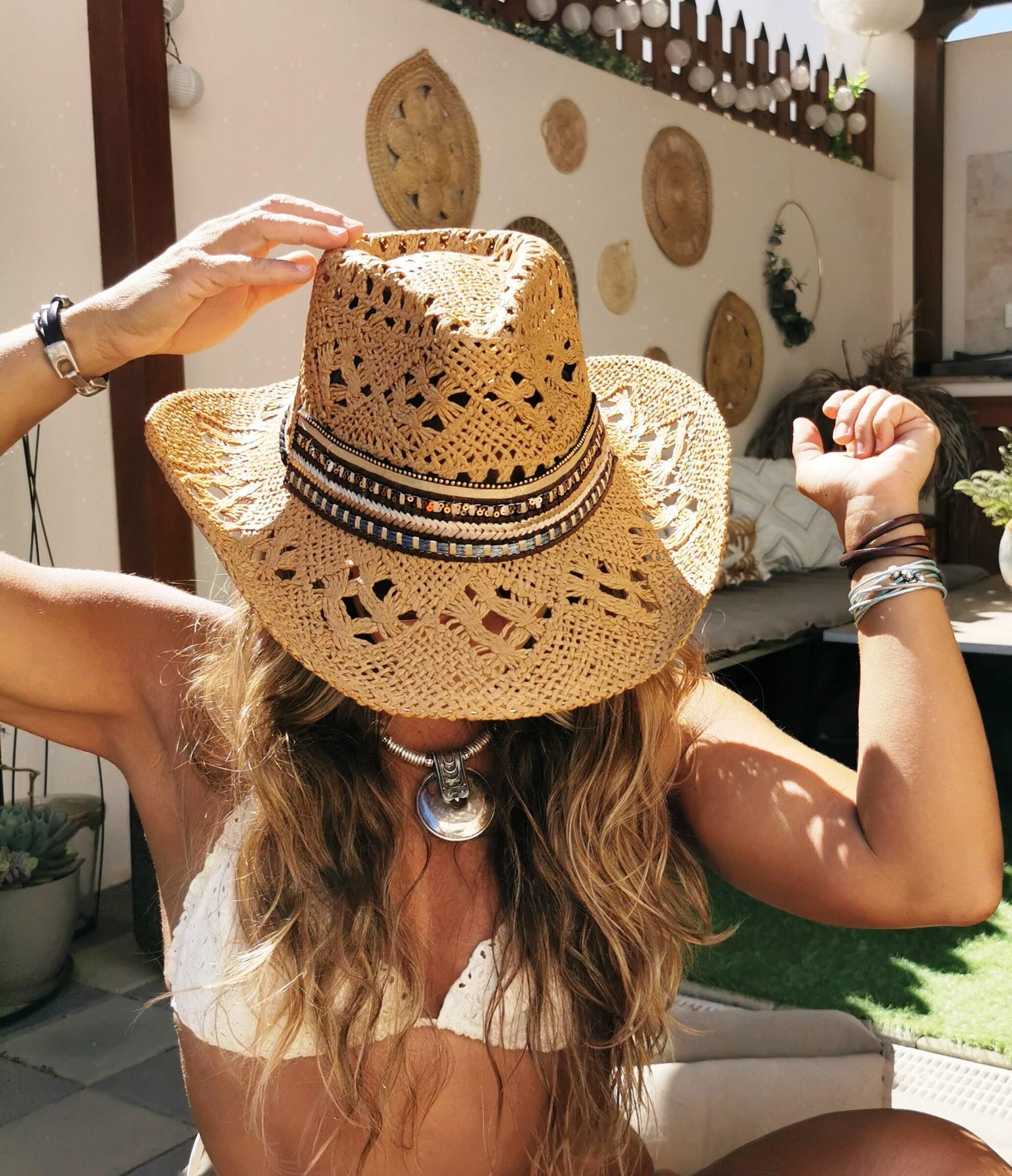 ♥ Handmade cowboy straw hat for summer outfits , vacation or holidays, elevate your style with this bohemian style hat custom made for Bride or Bachelorette party hat, or Music festivals. Unique custom hat perfect for birthday gifts, custom personalized gifts, and accessories gift. best selling items byKekugi bohemian Jewelry.