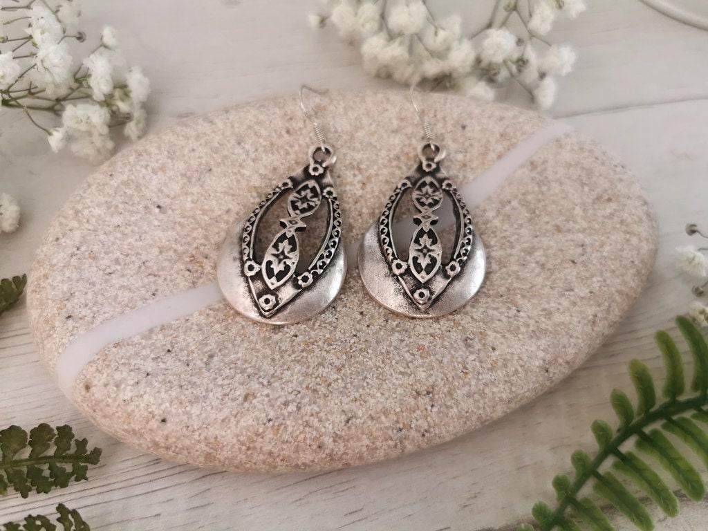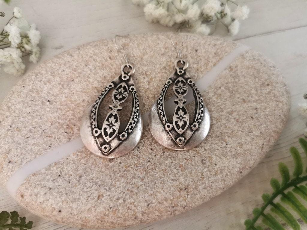 These earrings are made with sterling silver ear hooks and handcrafted silver plated charm pendants. Designed to be lightweight and skin-safe, each pair is made with attention to detail and artisan flair. Nickel-lead free and hipoallergenic, perfect for everyday use or special occasions.