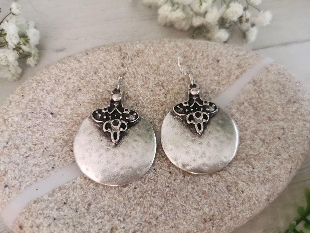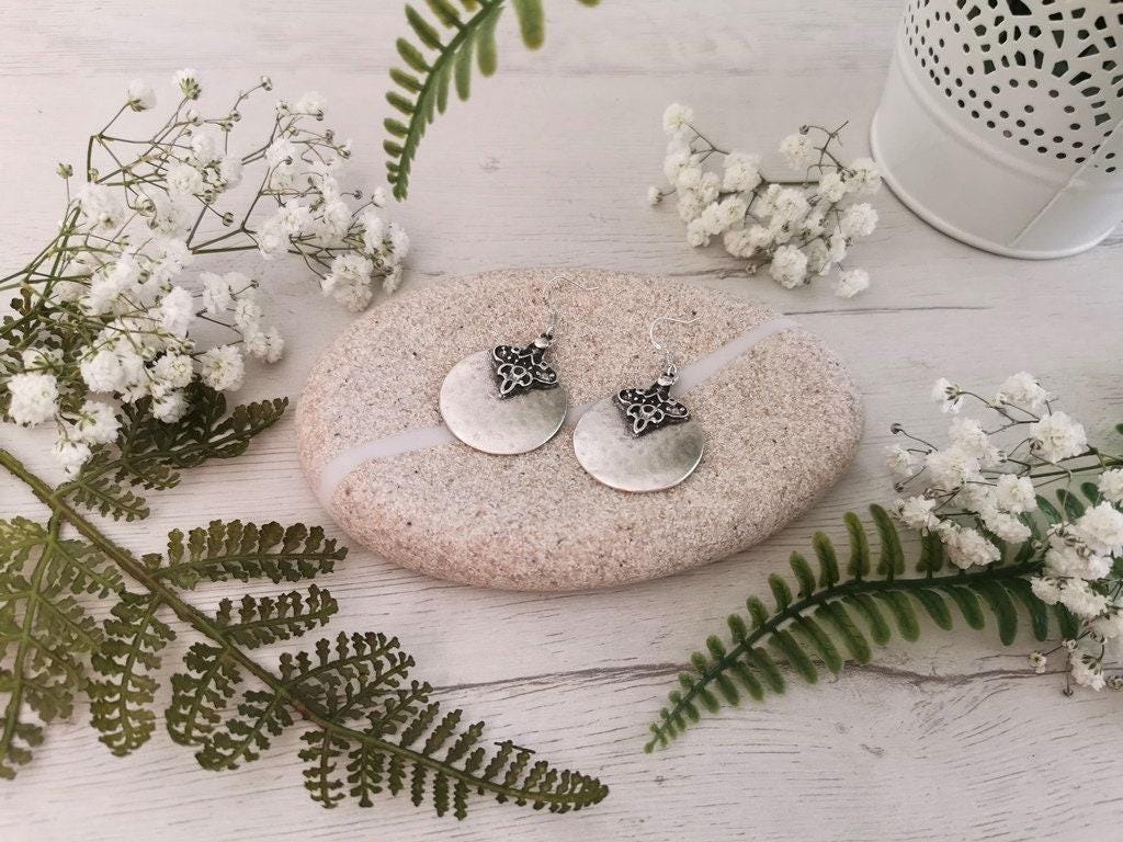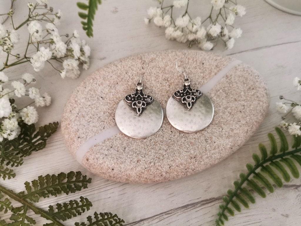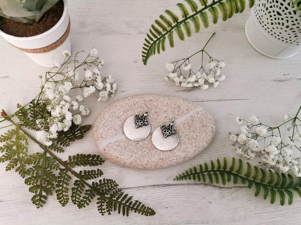 These earrings are made with sterling silver ear hooks and handcrafted silver plated charm pendants. Designed to be lightweight and skin-safe, each pair is made with attention to detail and artisan flair. Nickel-lead free and hipoallergenic, perfect for everyday use or special occasions.