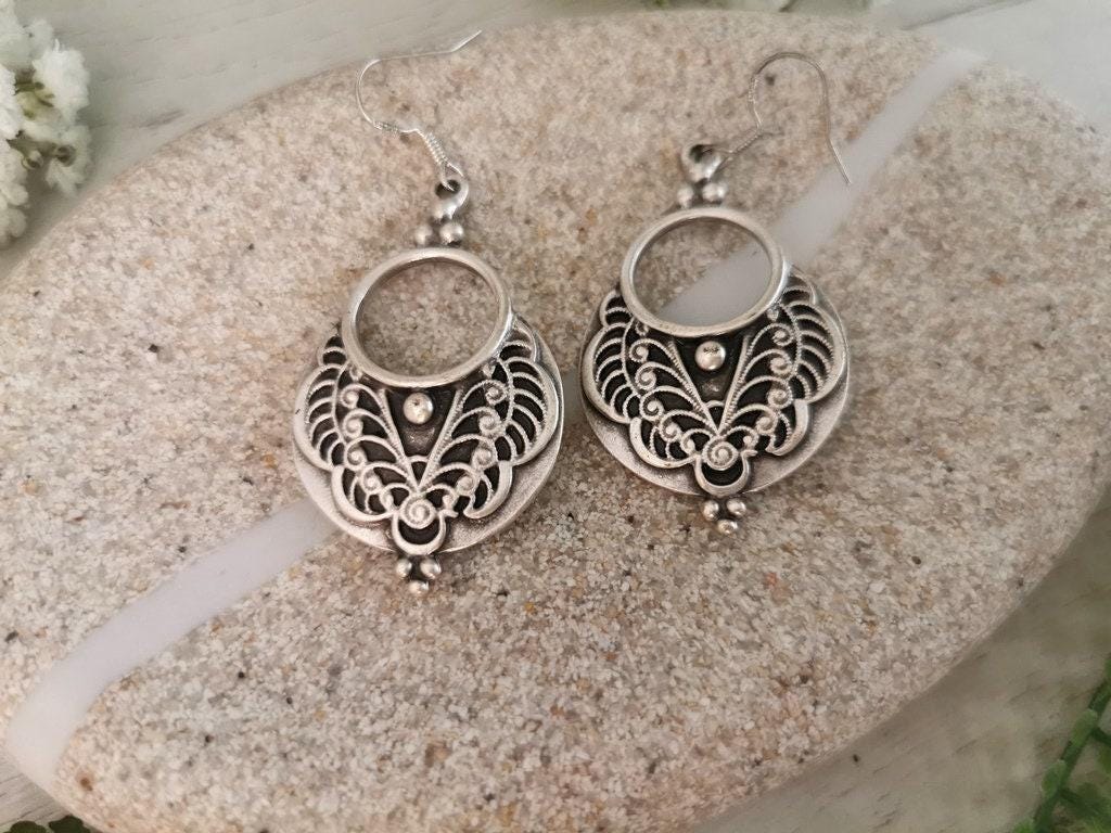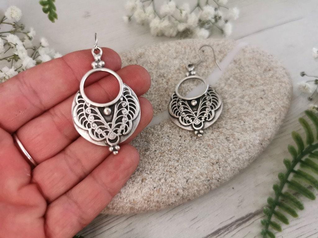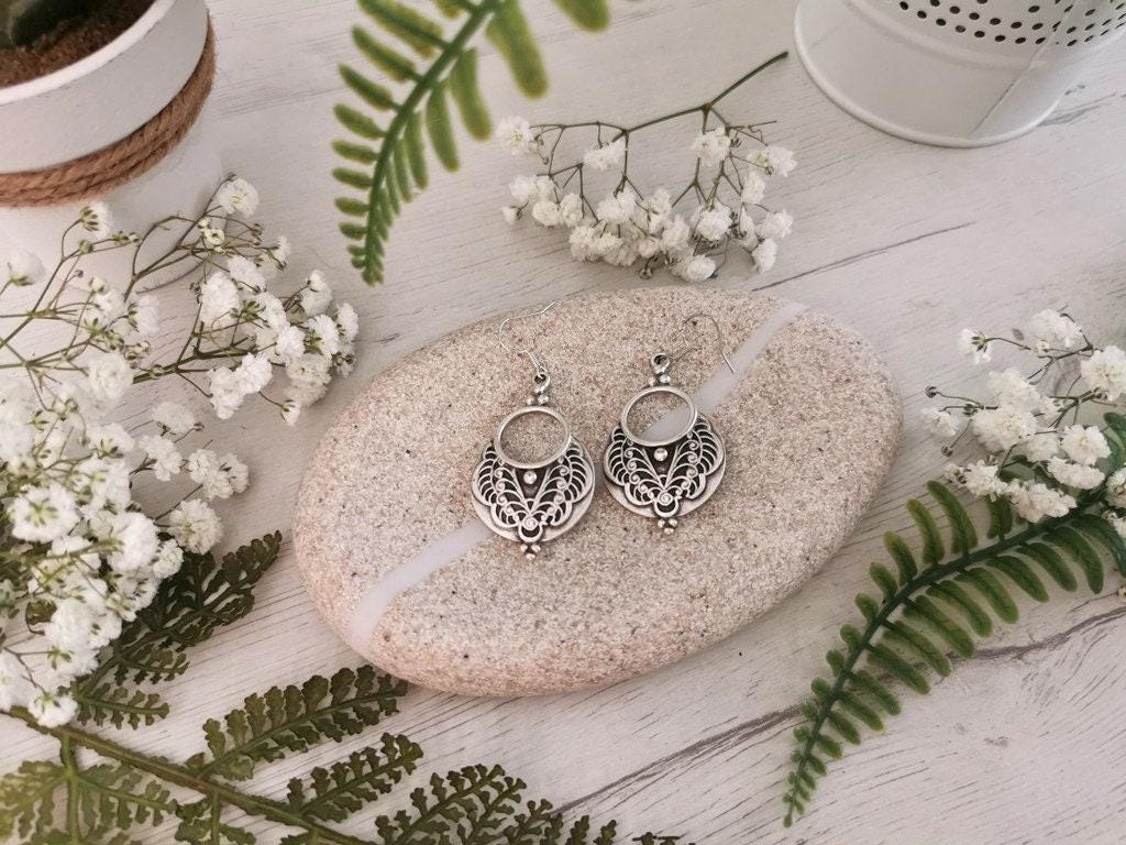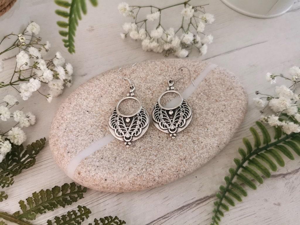 These earrings are made with sterling silver ear hooks and handcrafted silver plated charm pendants. Designed to be lightweight and skin-safe, each pair is made with attention to detail and artisan flair. Nickel-lead free and hipoallergenic, perfect for everyday use or special occasions.