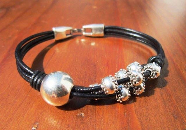 Leather & Silver Charm Beaded Bracelet • Handmade Jewelry Gift for Her • Custom Bracelet Gift • Personalized Jewelry Gifts by Kekugi