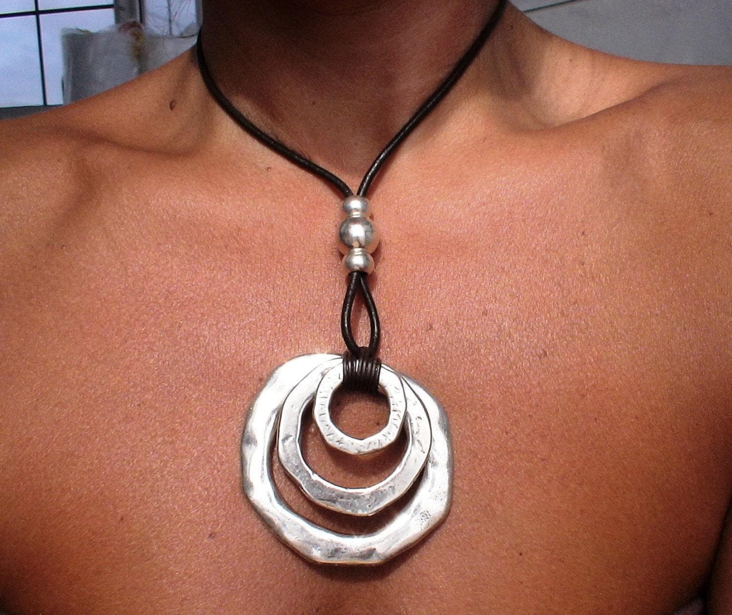 ♥ Elevate your style with this Chunky Statement Pendant Necklaces, a Silver beaded Ring necklace Charm on leather, a bold statement piece for everyday style. It is part of our best selling items, a perfect blend of timeless style handmade jewelry. Silver Chunky charm necklace for couples, necklaces for women made to size to match your style. Designed as a delicate charm necklace, a layered pendant necklace, it’s available in multiple lengths to match your style. at KEKUGI you can find pendant necklaces, beaded necklaces, charm necklaces, choker necklaces, multi-strand layered necklaces and lariat & Y necklaces, unique bohemian jewelry Best selling items designs gift for Her, birthday gift or personalized gifts.