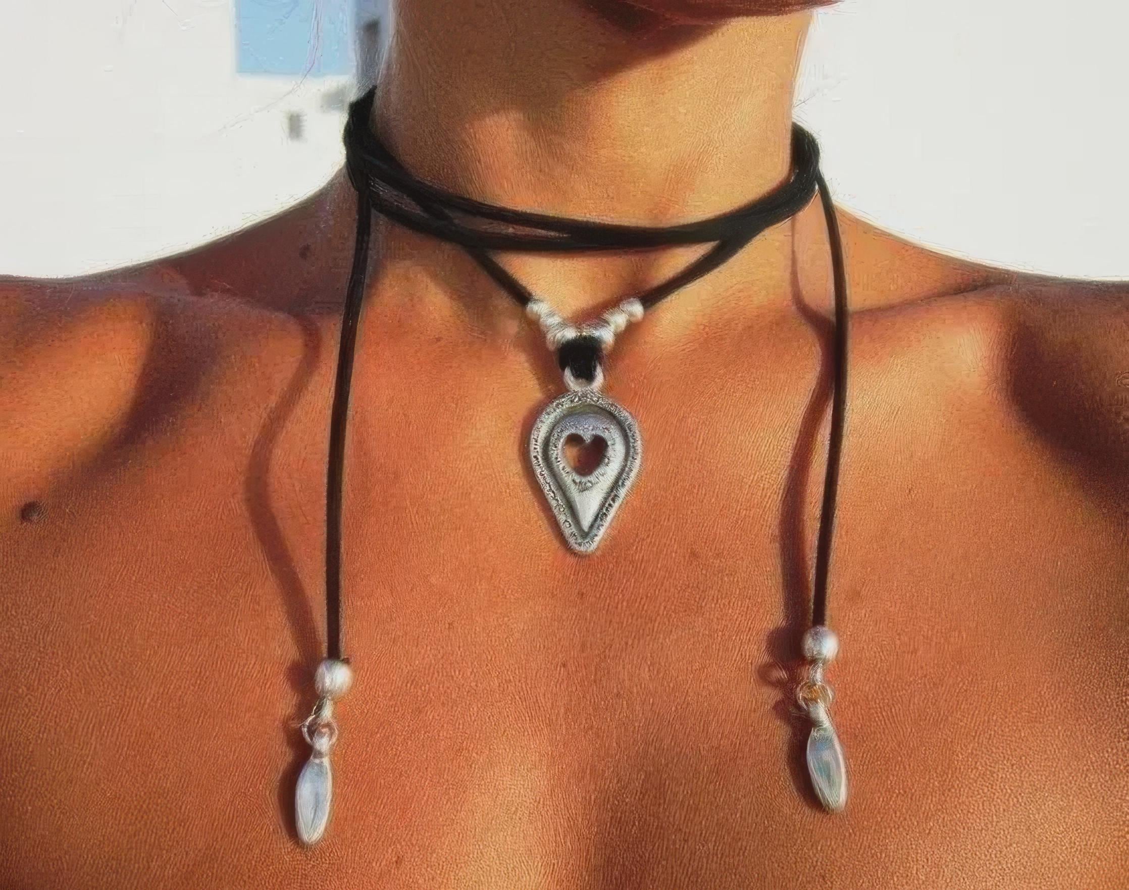 Boho Leather and Silver Beaded Pendant Heart Necklace • Long Statement Chunky Charm Necklace Gift for Her • Bohemian Jewelry Galentine Gift