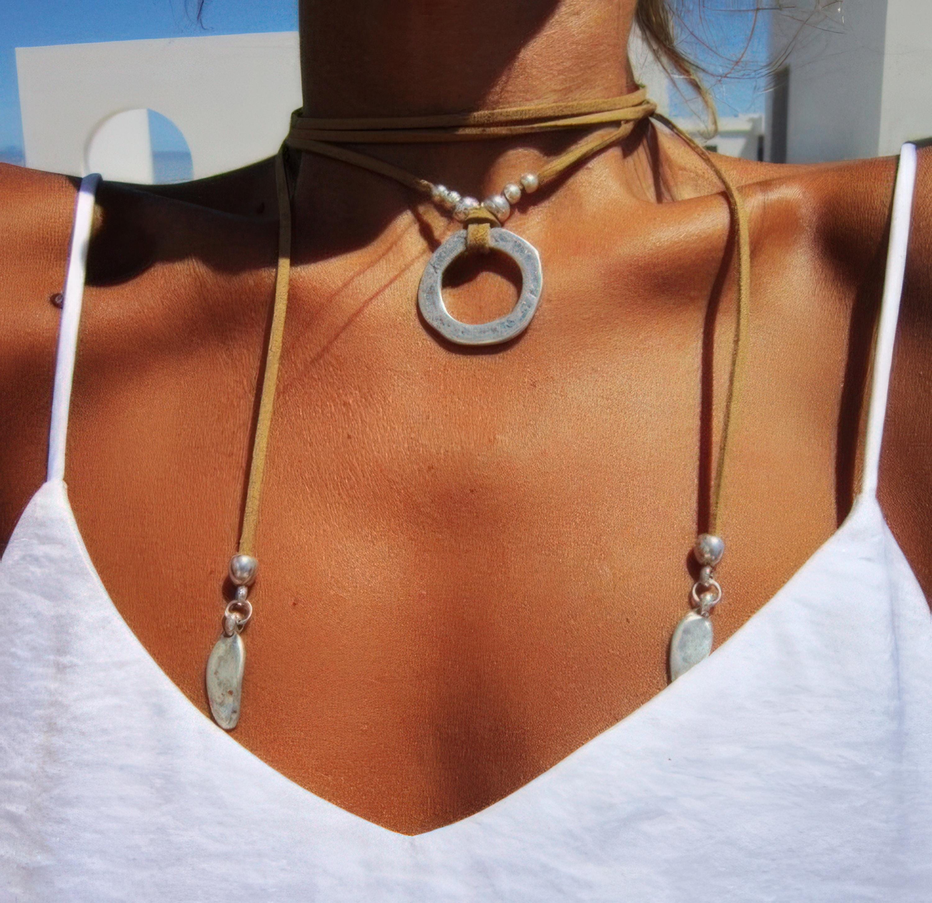 To preserve the look of your leather and silver jewelry, avoid water, cosmetics, and cleaning products. Always store your jewelryin a dry place and use a soft cloth to clean silver parts. Leather may naturally darken slightly over time, giving your jewelry a unique, lived-in feel.