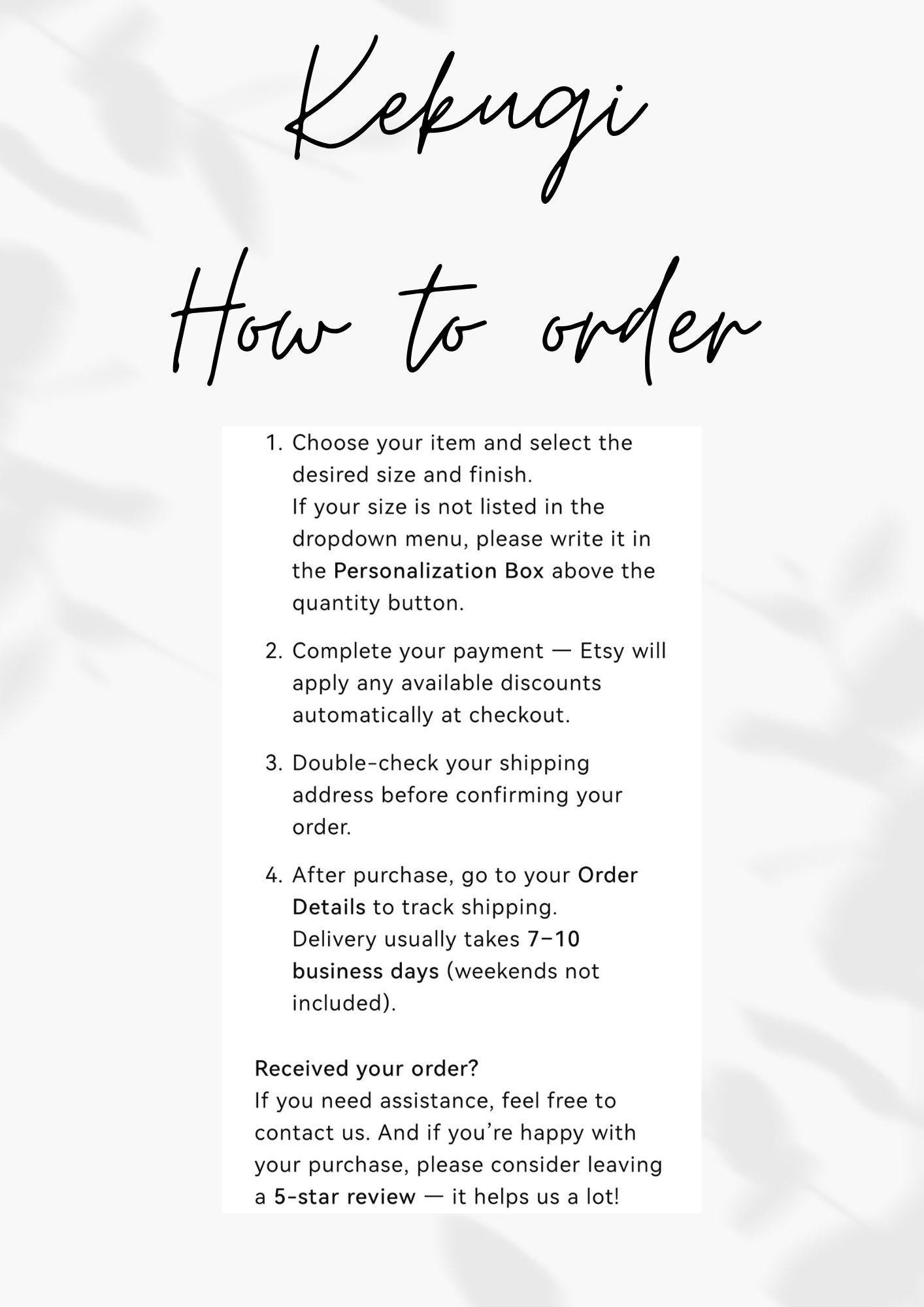 When you purchase a design from kekugi, you can know that you’re getting quality hand-crafted jewelry that’s made by people who really care, we are diligent with our craftsmanship. We love our customers and will make sure you’re well taken care of.