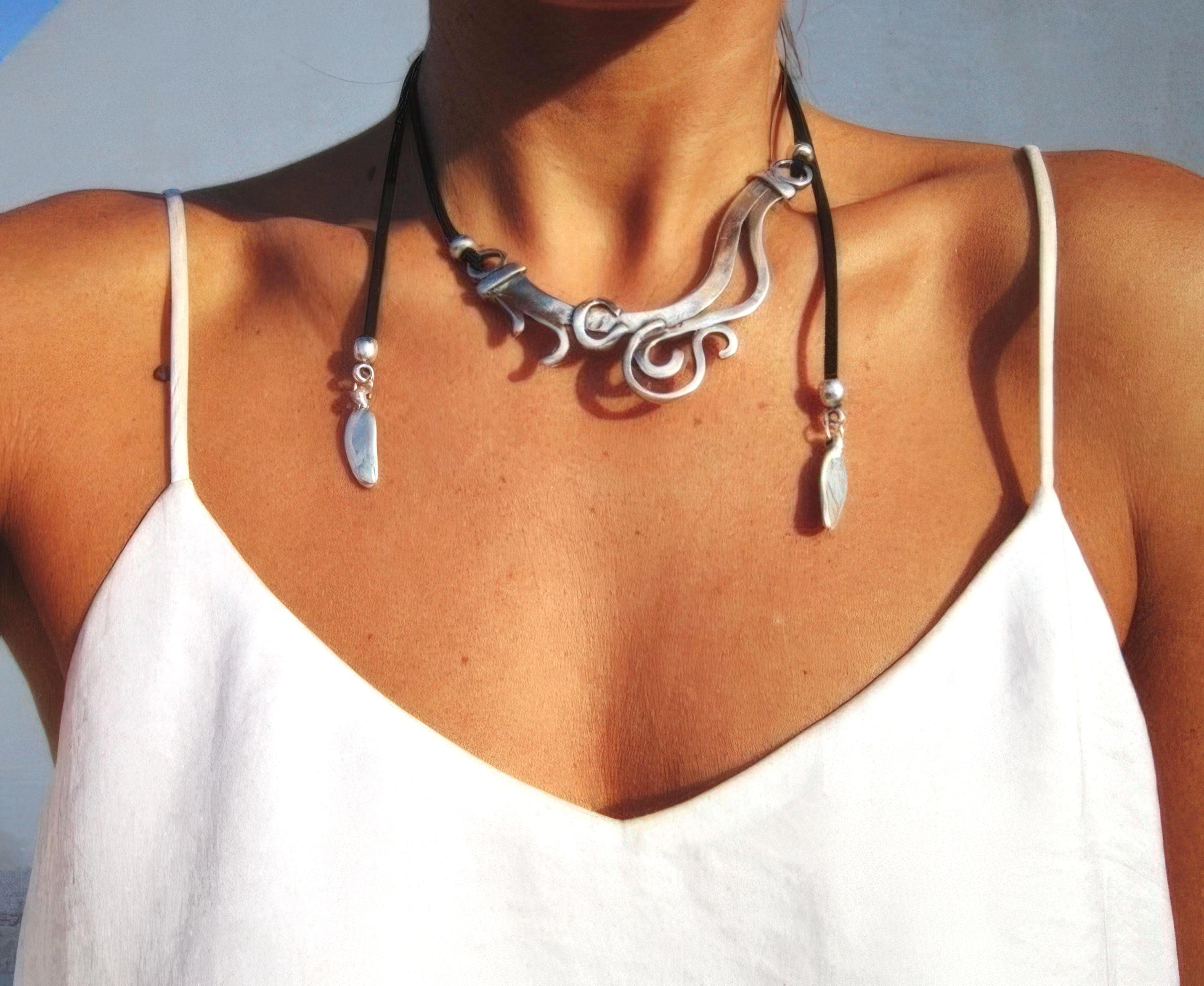 Statement Silver Chunky Pendant leather Necklace • Bohemian Neotribal Jewelry • Custom necklace Best Selling Items • Host Gift for Her