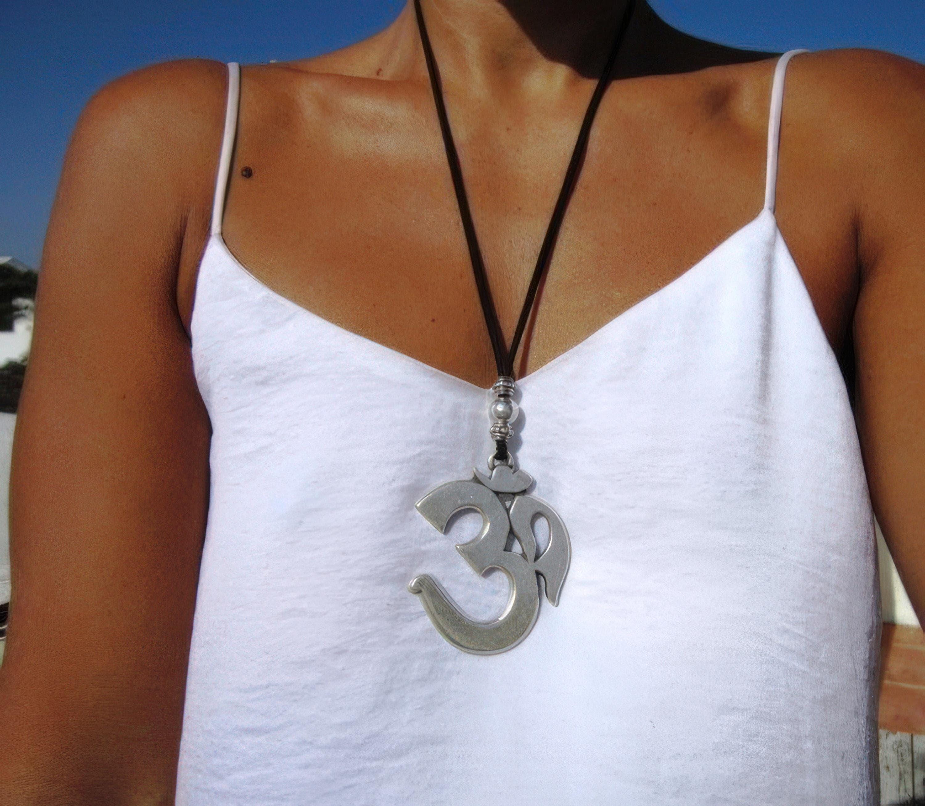 Silver Everyday Pendant Beaded Om Hamsa Necklace • Long Boho Layered Chunky Necklace