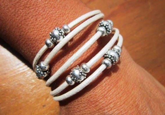 white Leather & Silver Charm Beaded Bracelet • Handmade Jewelry Gift for Her • Custom Bracelet gift • Personalized jewelry gifts by kekugi