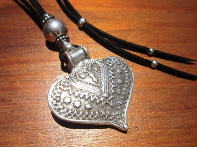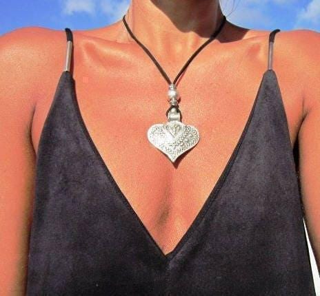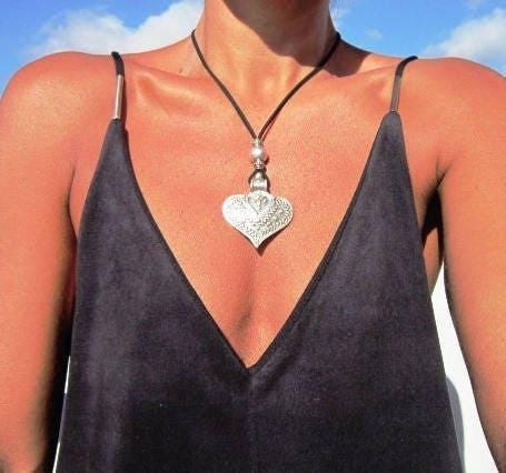 Boho Leather and Silver Beaded Pendant Heart Necklace • Couples Long Statement Chunky Charm Necklace Gift for Her • Bohemian Jewelry