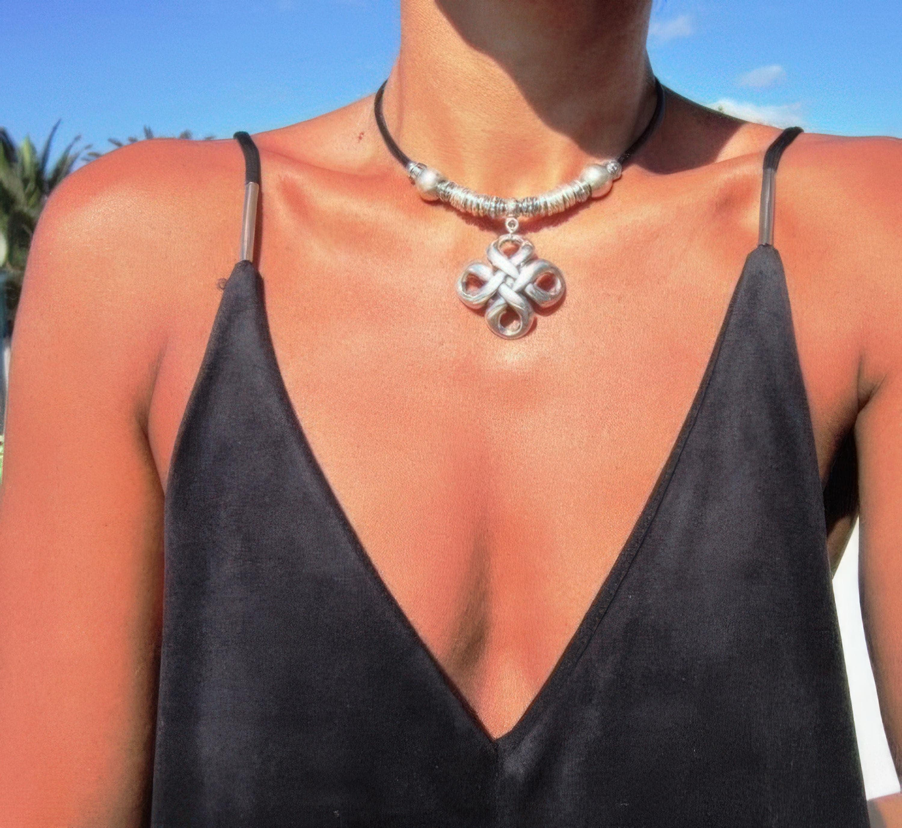 To preserve the look of your leather and silver jewelry, avoid water, cosmetics, and cleaning products. Always store your jewelryin a dry place and use a soft cloth to clean silver parts. Leather may naturally darken slightly over time, giving your jewelry a unique, lived-in feel.