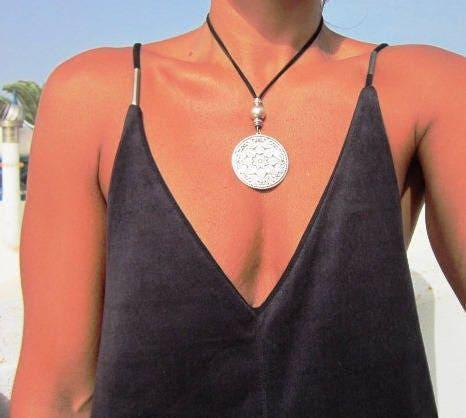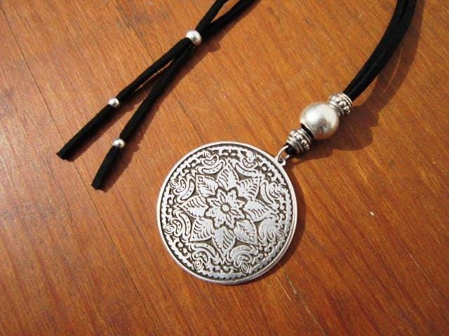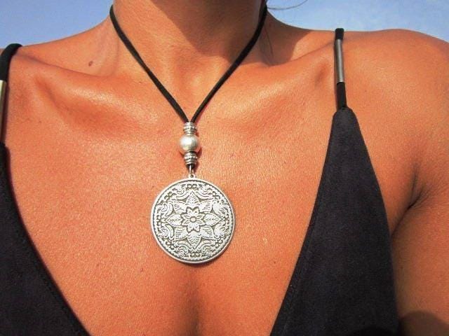 Statement Silver Chunky Pendant leather Necklace • Bohemian Jewelry Best Selling Items • Gift for Her • Neotribal Jewelry Boho Necklace