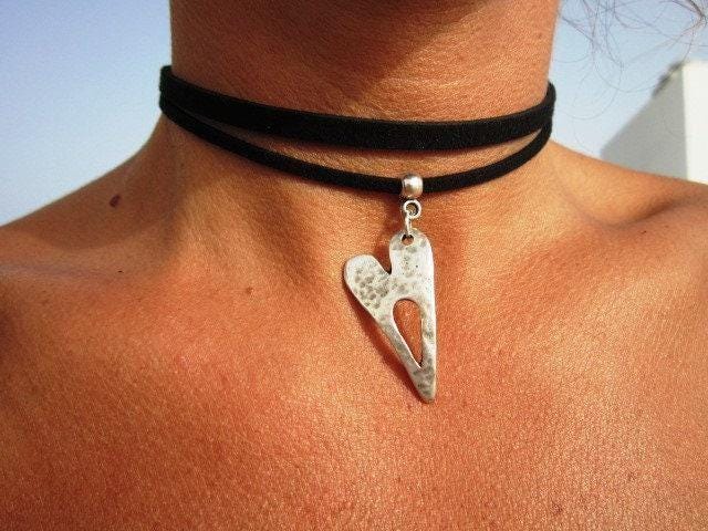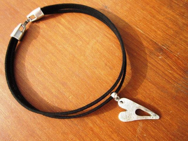 Silver Beaded and Leather Choker Necklace with heart charm • Handmade personalized jewelry