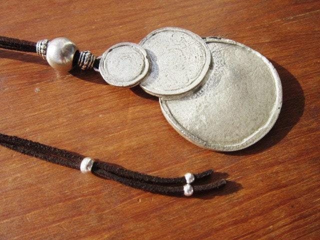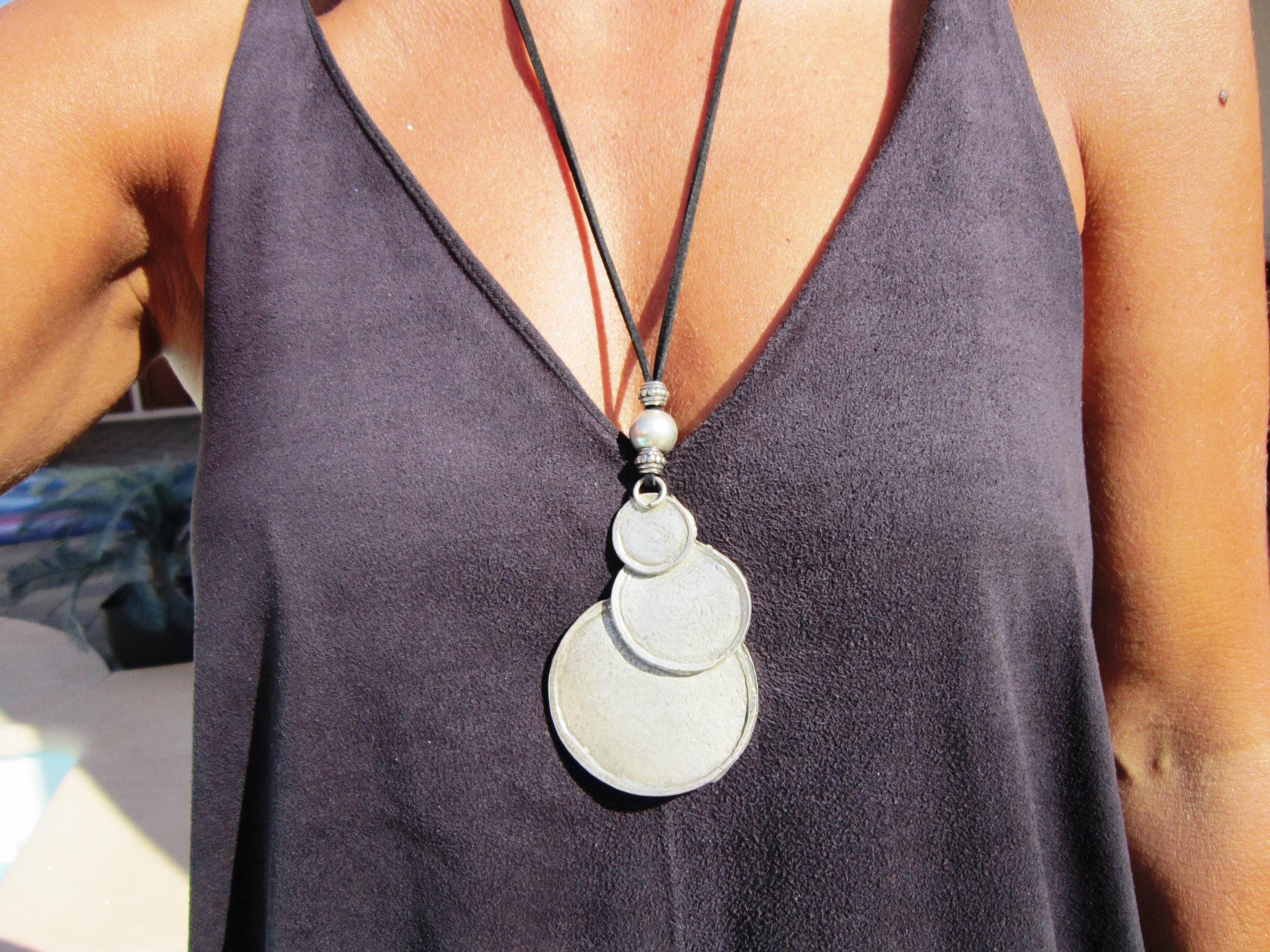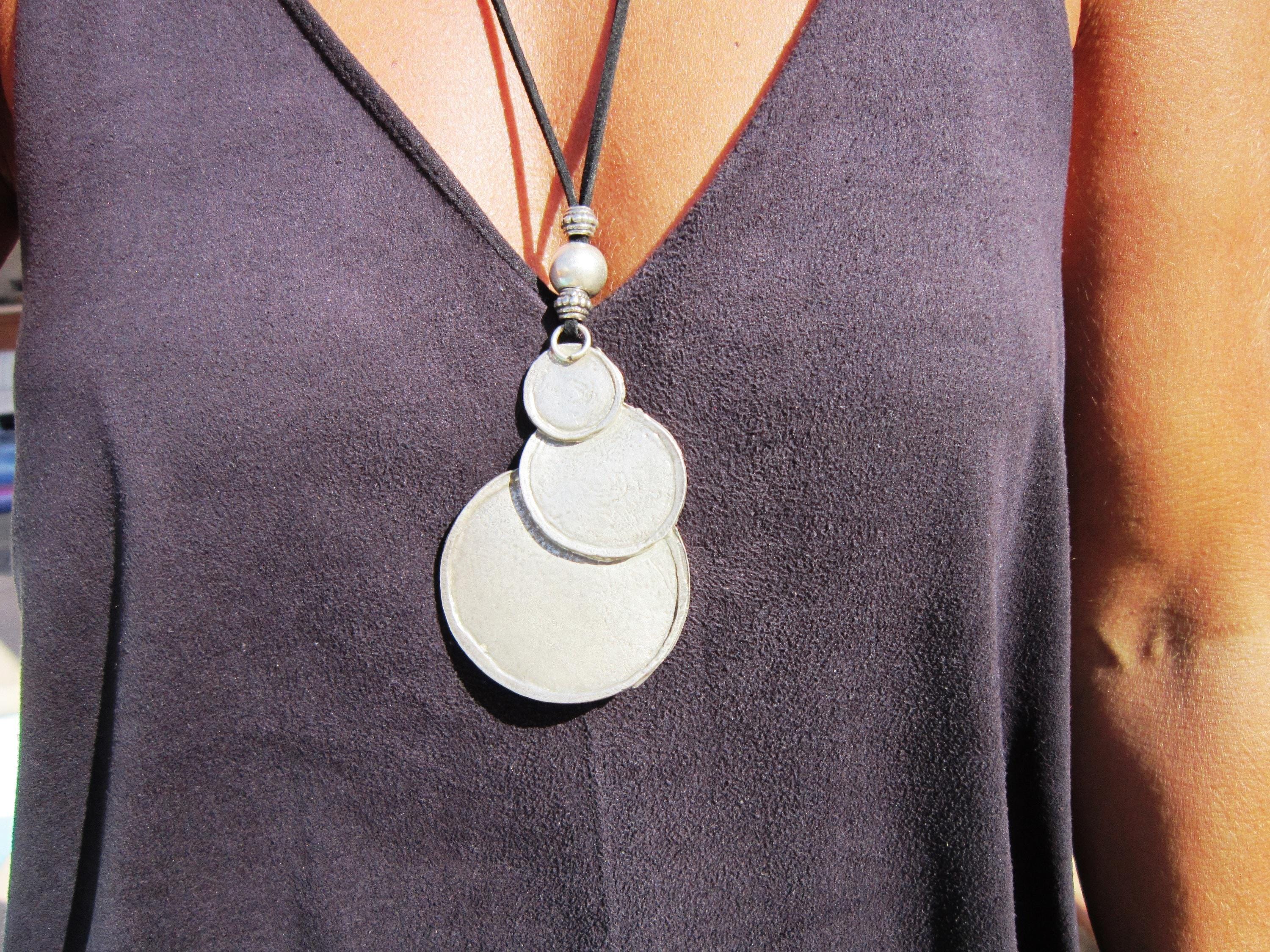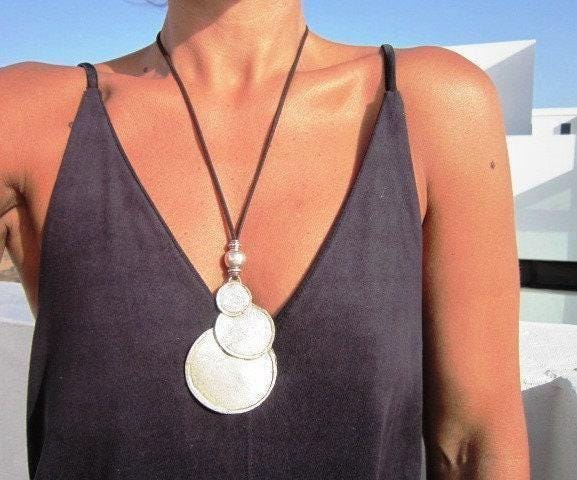 Statement Silver Chunky Pendant leather Necklace • Bohemian Jewelry Best Selling Items • Host Gift for Her • Neotribal Jewelry Gift for Host