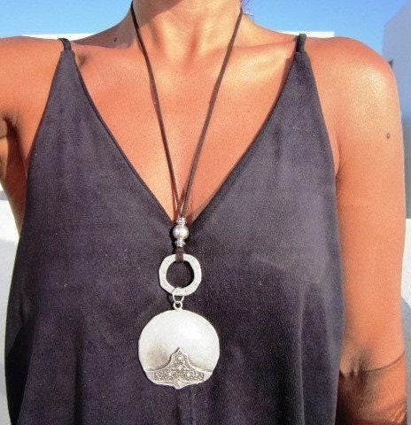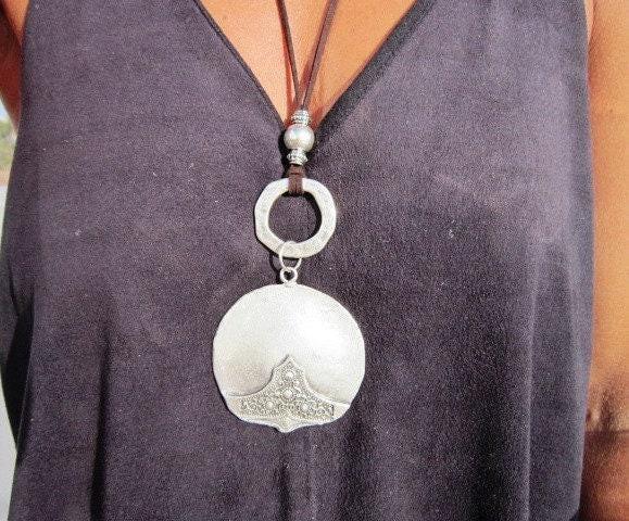 Statement Silver Chunky Pendant leather Necklace • Bohemian Jewelry Best Selling Items • Gift for Her • Neotribal Jewelry Boho Necklace