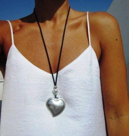 Boho Leather and Silver Beaded Pendant Heart Necklace • Couples Long Statement Chunky Charm Necklace Gift for Her • Bohemian Jewelry