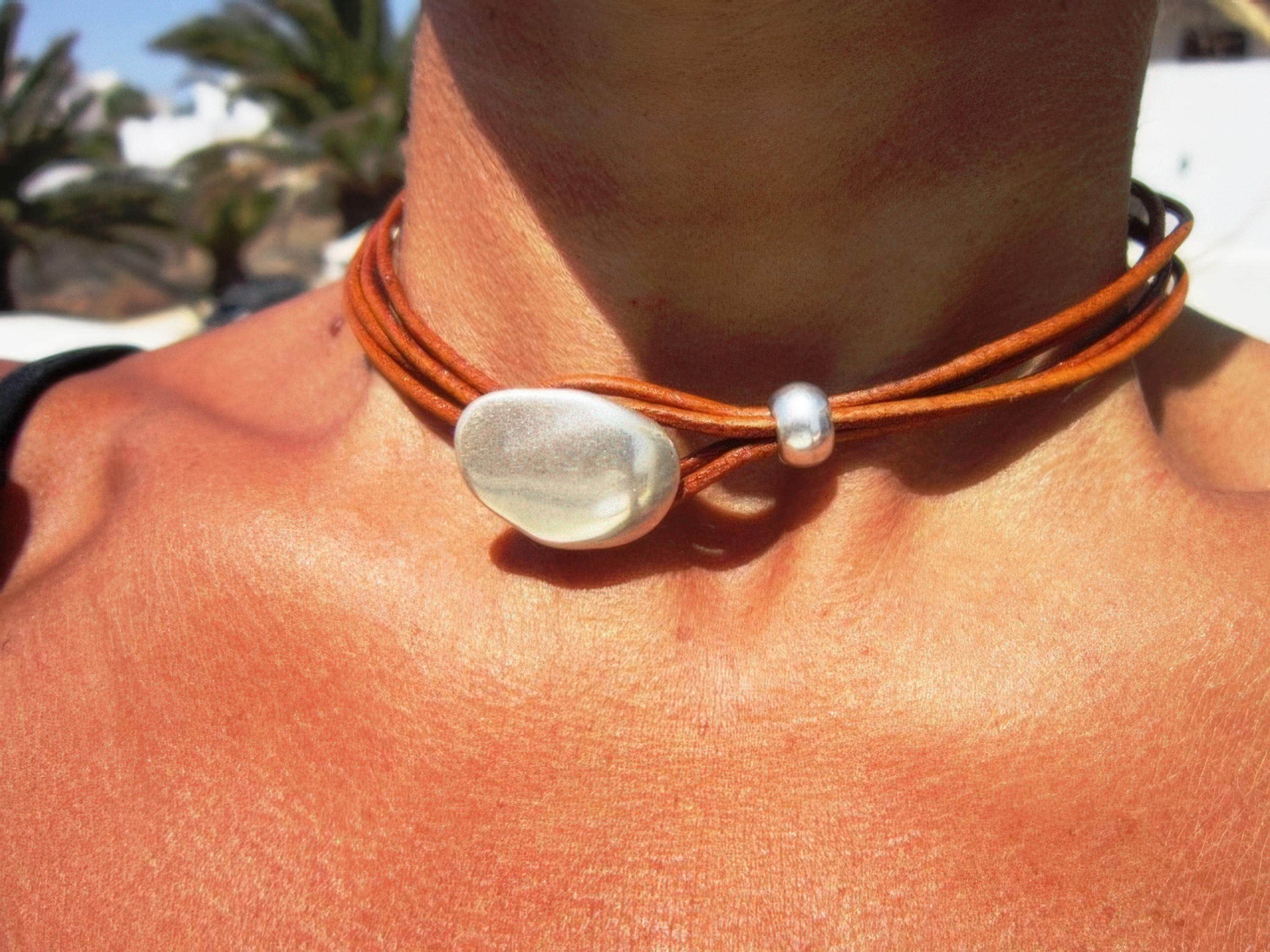 Silver beaded Leather Choker Necklace • Silver Necklaces for Women • Bohemian Handmade personalized Jewelry • Best selling items by Kekugi