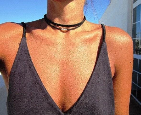statement necklace choker, Trendy leather choker, leather and silver beaded necklace, Bohemian jewelry, choker necklace