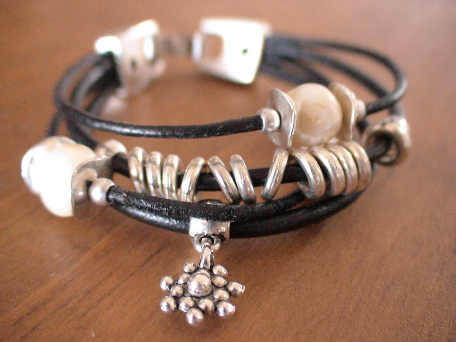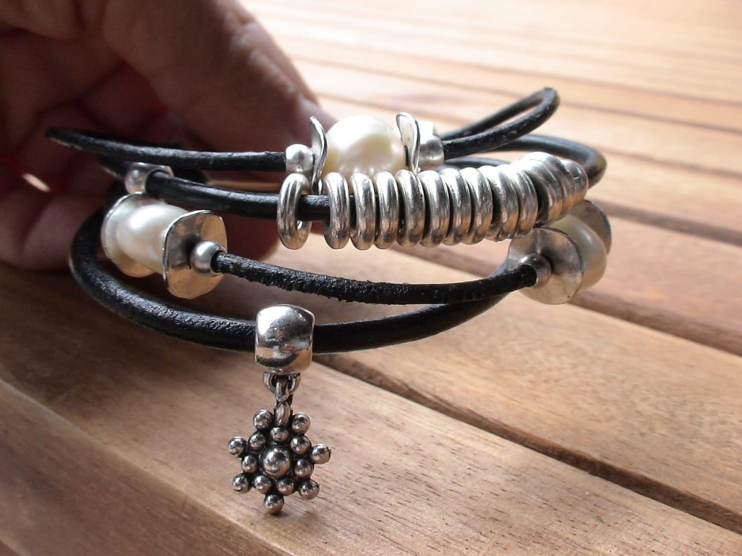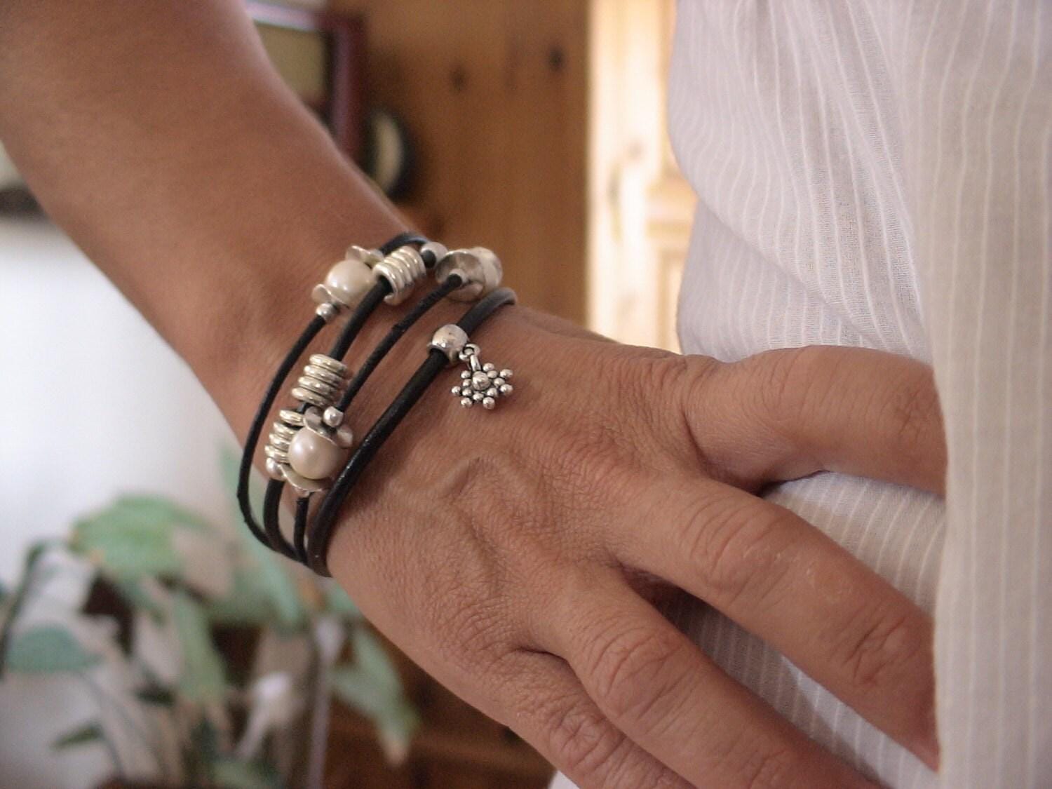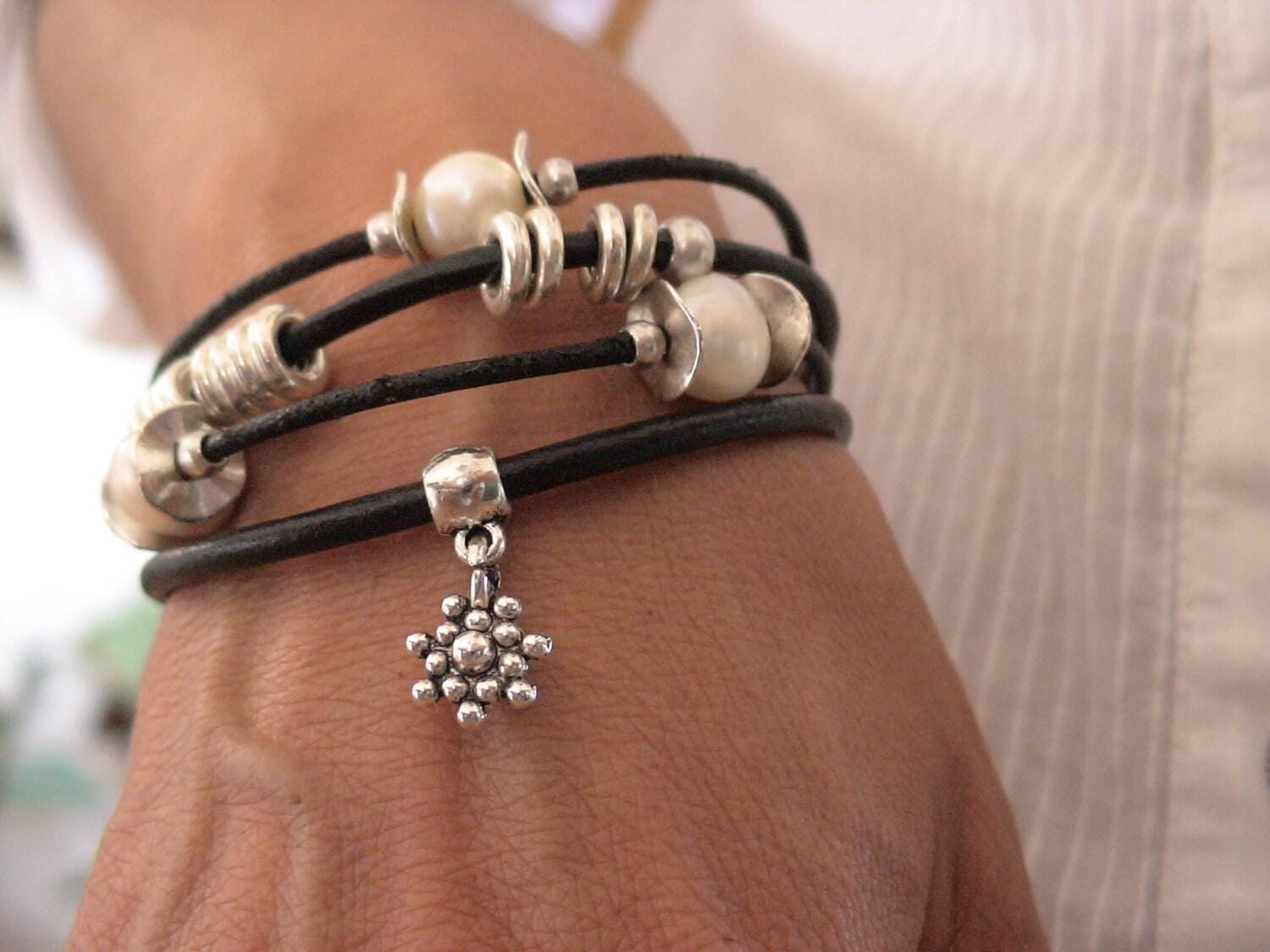 pearl and Leather bracelet with silver beads and fresh water pearls. An everyday jewelry!! womens bracelets, pearl bracelet, silver bracelet, pearl jewerly, beaded Bracelet original designs by kekugi.