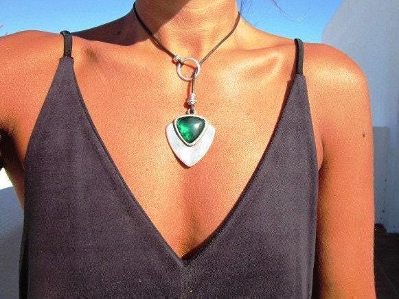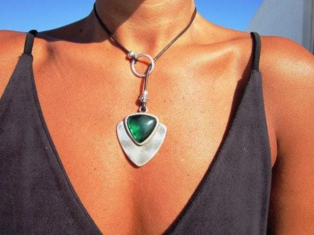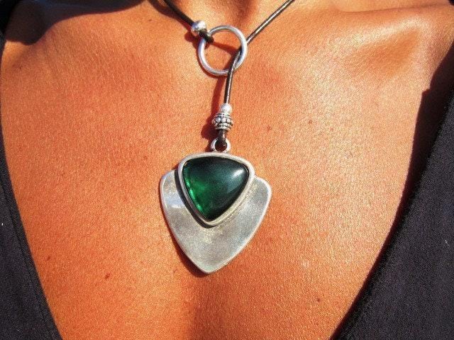 •The stone is a green resin cabochon securely set onto the pendant base.