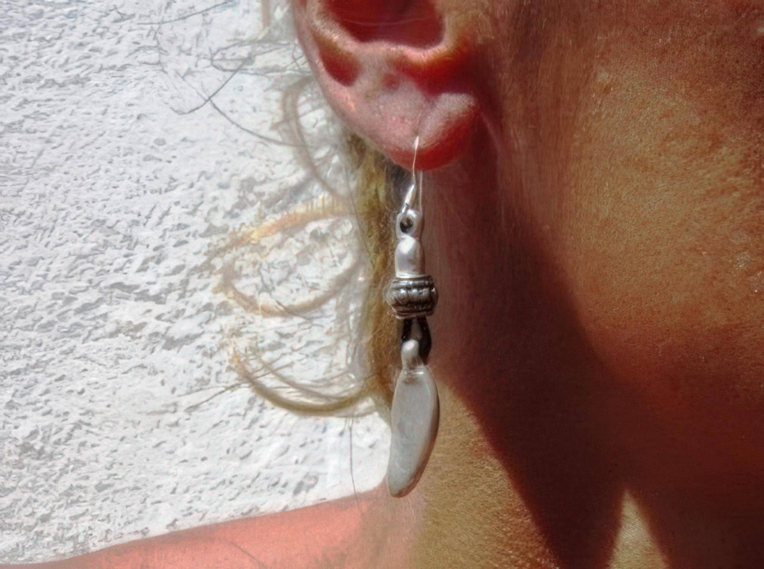 These earrings are made with sterling silver ear hooks and handcrafted silver plated charm pendants. Designed to be lightweight and skin-safe, each pair is made with attention to detail and artisan flair. Nickel-lead free and hipoallergenic, perfect for everyday use or special occasions.