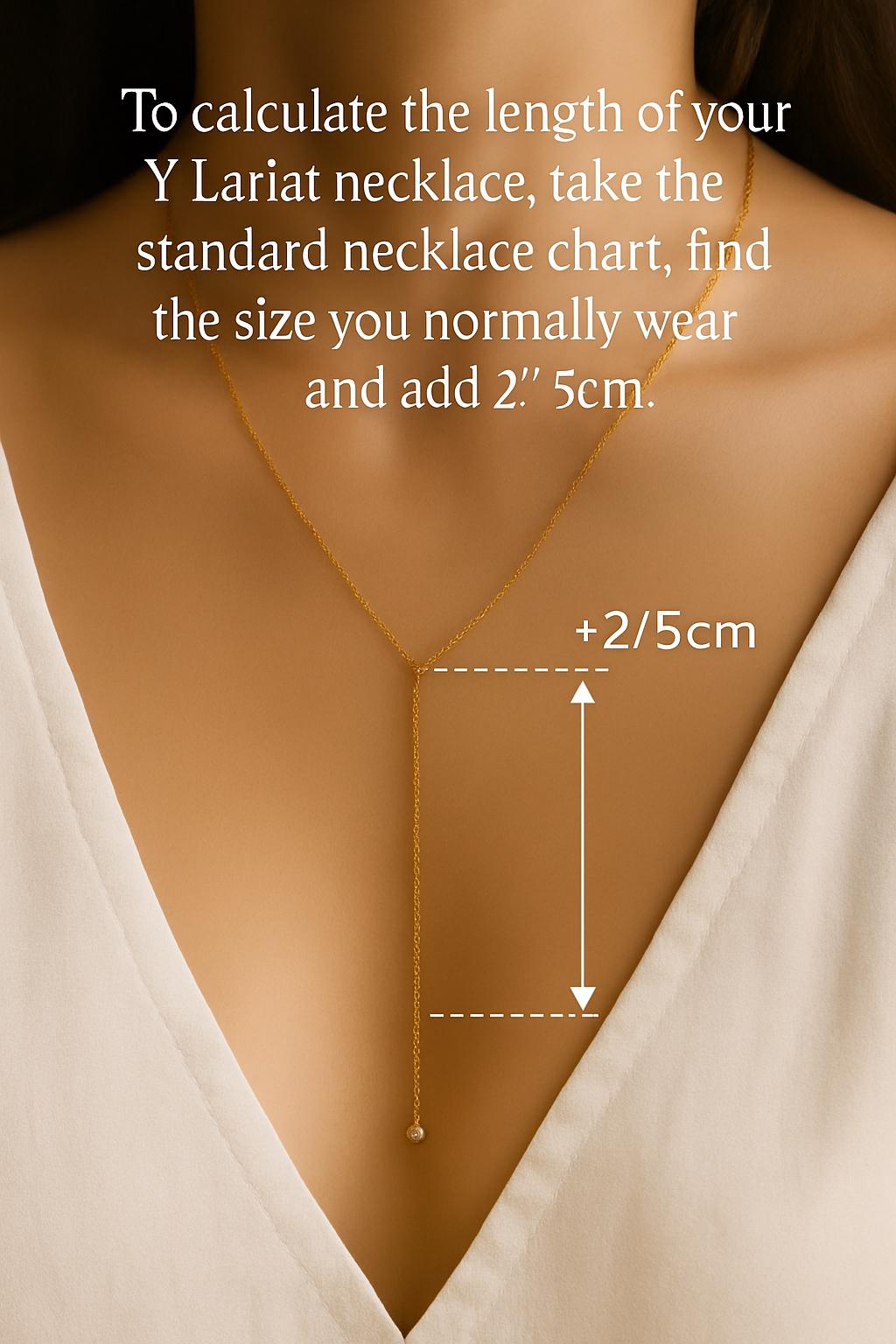 To calculate the length of your Y Lariat necklace, take the standard necklace chart, find the size you normally wear and add 2” / 5cm
